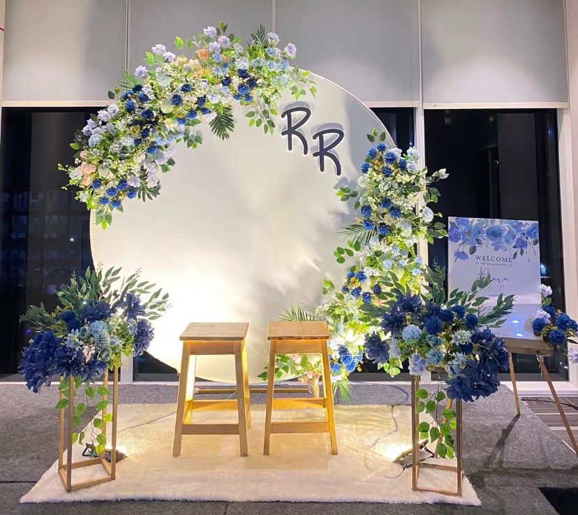Backdrop Wedding Circle Floral kami adalah pilihan populer bagi pasangan yang menginginkan dekorasi pernikahan yang modern dan romantis. Backdrop ini memiliki bentuk lingkaran berukuran besar dengan warna putih bersih. Selain itu, bingkai lingkaran ini dihias dengan rangkaian bunga artificial (imitasi) berwarna biru, putih, dan sedikit hijau dedaunan. Warna biru memberikan kesan tenang dan elegan, sementara putih melambangkan kesucian.