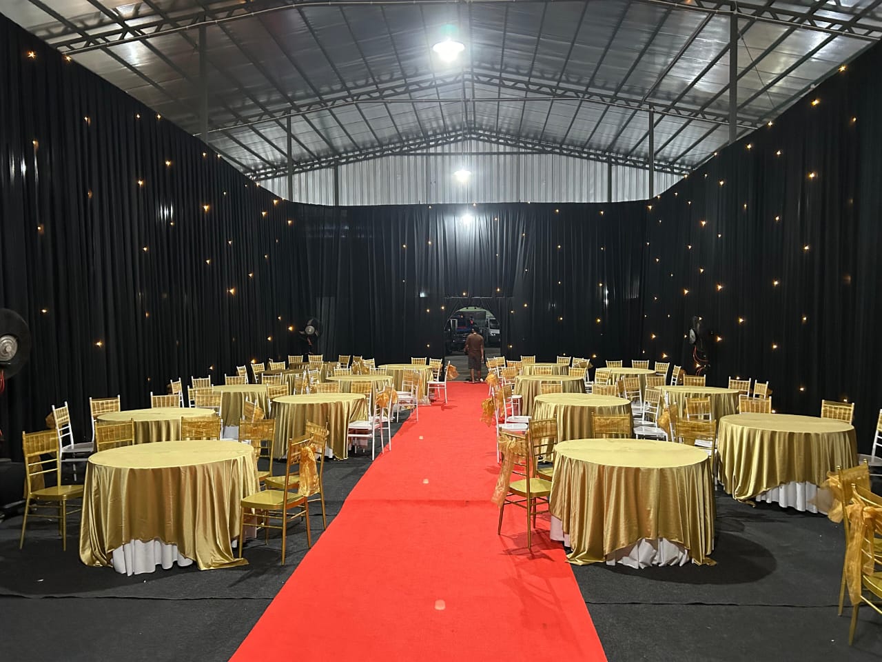 Jalur tengah ruangan kami hias dengan karpet merah tebal (red carpet). Ini berfungsi sebagai jalur kehormatan. Meja-meja bundar ditutup taplak emas (gold). Dengan demikian, seluruh ruangan memancarkan nuansa black and gold yang mewah. Dekorasi ini sangat cocok untuk wedding party, penghargaan, atau jamuan corporate.