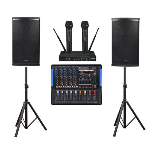 - Komponen Utama: Speaker Aktif (2 unit), Mixer Audio (4-16 Channel), Mikrofon Wireless (2 unit), Stand Tripod Speaker